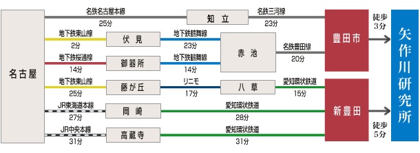 インターを出てすぐ左折。直進してつきあたりを右折。国道153号線をしばらく直進して鉄道を二つくぐると豊田市役所がみえる。インターを出てすぐより市役所の案内標識あり。