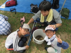 今回初めて、この場所を整備する愛護会の方々とこの場所を利用する親子をマッチングしました。「川遊びする親子を見に来てください」とお願いしたら、釣り糸の結び方やエサの付け方、昔の生き物の話などで参加者親子との交流もしてくださいました。このような関係が今後も続いていってほしいです