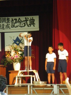 式典では、子ども達が水質汚濁調査の方法を実演し、矢作川の透視度を報告してくれました。