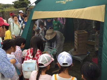 浜崎研究員よりニホンミツバチの生態や巣箱の構造などについて説明を行い、メッシュテントの中に巣箱を持ちこんで、中部日本ミツバチの会の方と共に巣枠を一段を切り取りました。巣枠には蜜がしっかり詰まっており、さっそく試食してもらいました。