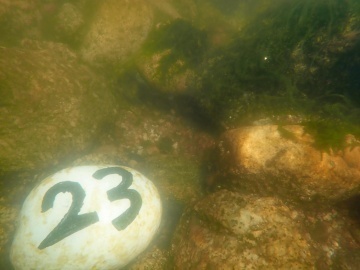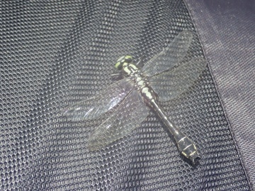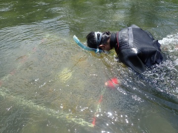 コケ植物が川底を覆う割合を確認するため、調査者は水中マスクを付け川底をのぞくのですが,岩と間違えたのか、その背中にはホンサナエが止まり、しばらくそのまま張り付いていました。