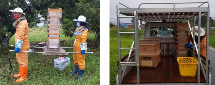 朝6時、働きバチの活動が活発になる前に作業を行いました。当初、新しい巣箱に移し替えて運び出す予定でしたが、予想よりも働きバチの数が多かったため、そのままの状態で巣箱ごと移動することになりました。ハチが出入りする巣門を閉じた後、運搬用の担架に乗せて軽トラックに積み込み、無事に運び出すことができました(写真1)。