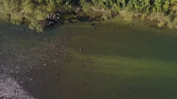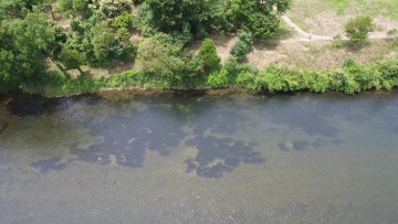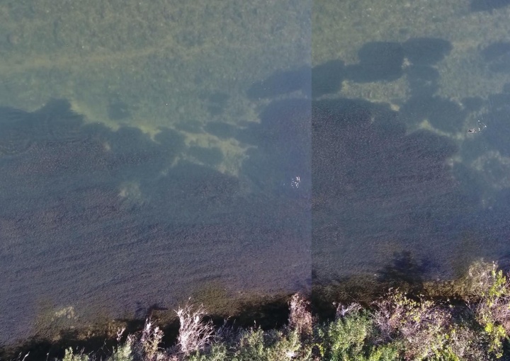 写真のように、水位も低く水が澄んでいるので、上空からもオオカナダモの群落がはっきりと分かります。