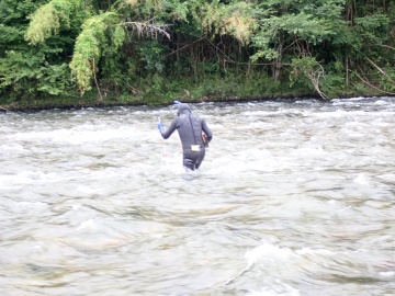 地元でアオンドロと呼ばれている糸状藻類の流程分布調査を6月28日から3日間連続で行いました(写真上・中)。矢作川の流れに沿って小渡、富田、広瀬、古鼡、豊田大橋の5箇所で調査しました。糸状藻類が最も多く生えていた場所は、富田と古鼡でした。極めて多く発生すると、川底全面を覆うまでになりますが、今年はそこに達しない状況でした。