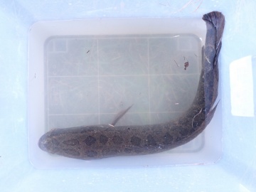 また、逢妻女川・男川ともに下流側の地点では、「クロコ」と呼ばれるひょろひょろとしたものから、体長50 cmくらいまでのウナギが採集されました。