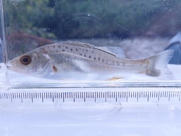 今年度は7月13,14日に逢妻女川、20,21日に逢妻男川を調査しました。逢妻女川の竹橋付近は三河湾から30 km程離れていますが、海岸近くでよく見られるスズキの幼魚や、海と川を行き来するアユ、ゴクラクハゼ、ヌマチチブ、ウキゴリ、テナガエビなどが採集されました。