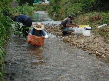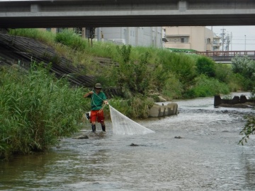 豊田市南西部を流れる境川水系逢妻女川・男川でたも網、かご網、さで網、投網などを用いて魚類、エビ・カニ類の調査を行いました。