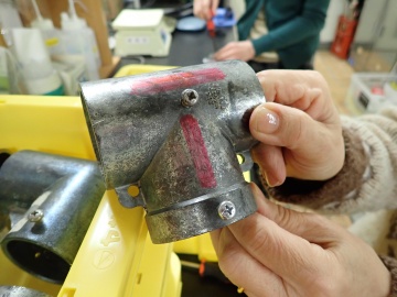 水量の安定しやすい冬季に実験を実施するのですが、かじかんだ手でも水中でパイプをつなぎやすいようにあらかじめネジを少し入れ込んでおくとのこと(少し浮いたネジは手抜きというわけではありません!)。その工夫に感心していると、内田さんからさらに追い打ちが。赤く塗られた繋ぎ手を見せて、「上下方向が分かるように目印も入れている」とのこと。現場での作業を極限まで効率化する努力に驚くばかりでした。