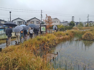 初音川ビオトープでは副会長さんが、この日のために特別に掲示板を立てて活動紹介をして下さいました。参加者の皆さんは、企業ボランティアも巻き込んで実施している外来種の駆除や、きめ細かく計画を立てて植生管理を行っている話に耳を傾けておられました。往復のバスの中では「百々水辺愛護会の養蜂を見学したい」といった声が出るなど、今年新しく立ち上がった会も含め、愛護会同士の交流が進んだ手ごたえも感じることができました。(洲崎燈子)