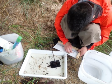 それに先立ち,2025年6月10日に,下河内橋付近の2地点で,予備調査を行いました.職場体験で来所した末野原中学校2年生の生徒(堀田さん)も調査に参加してくれました.雨の降る中,カッパを着て,一生懸命に調査してくれました.