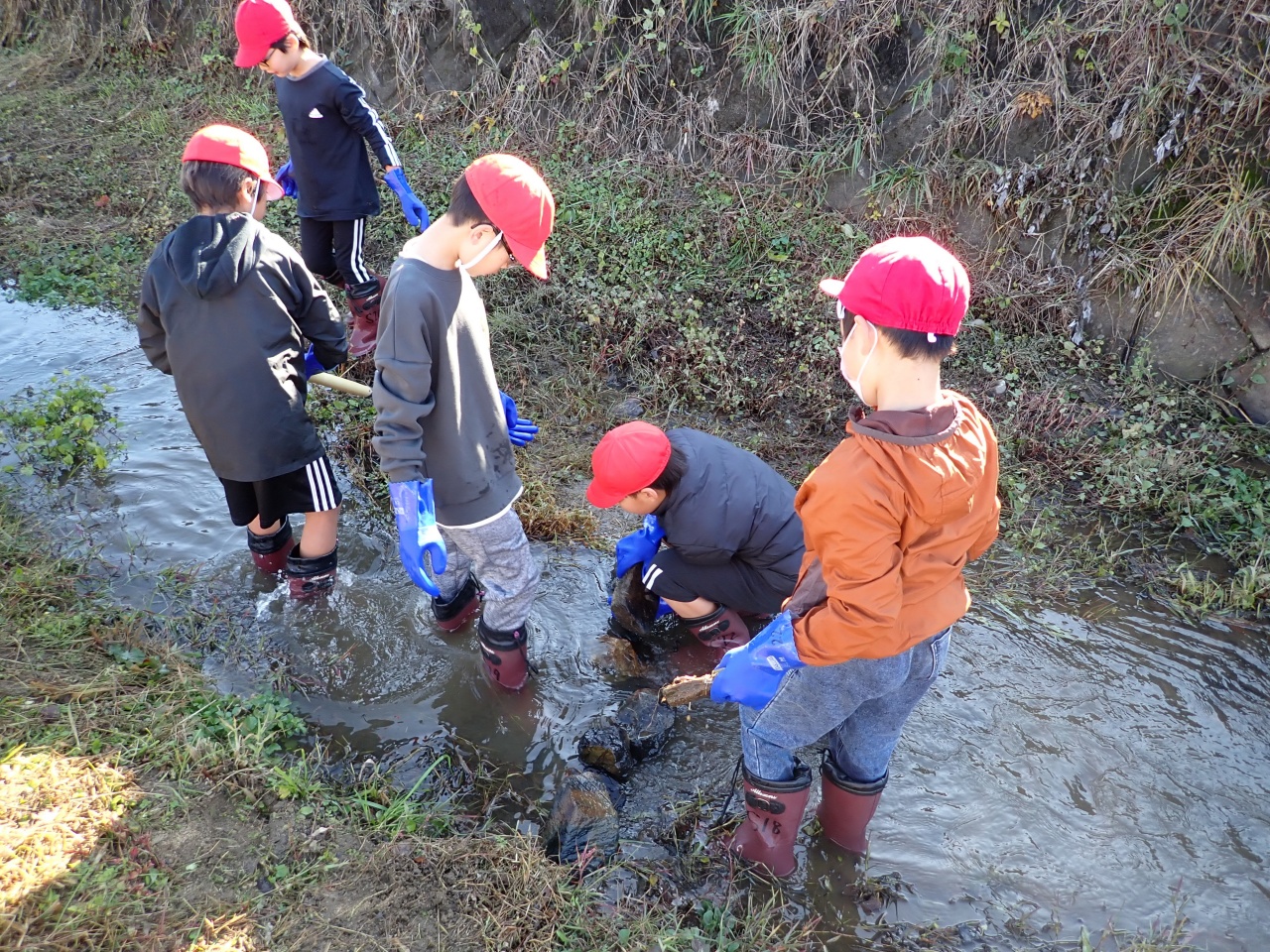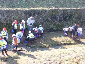 2025年11月26日に平井小学校4年生(46人)が岩本川で川学習を行いました。