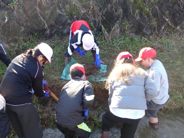 この実践は、住民団体「岩本川創遊会」も行っている「水辺の小さな自然再生」※2の活動と言えるでしょう。今回も岩本川創遊会の小野内会長と矢作川研究所の山本研究員が学習をサポートしました。