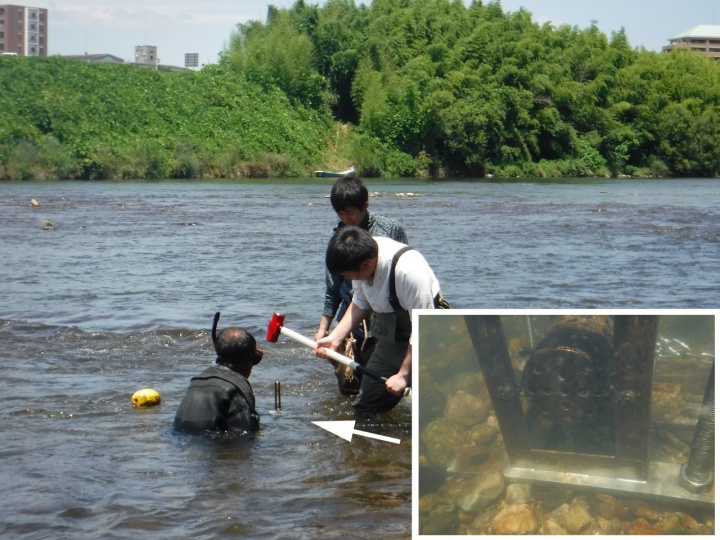 溶存酸素データロガーは10分間隔でデータを記録するようにしています。雨で川の水が増水し、私たちが調査に入れない時でもデータロガーはデータを記録してくれます。万が一、ロガーが流されたりしないように、川底にしっかりと固定することが重要なので、写真のようなステンレスのロガー設置台を製作してもらいました。この台は30kgありますが、流れないように、ステンレスの杭で川底に止めています。(内田朝子)
