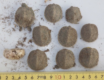 産卵場所は植栽された樹木の根元付近で、よく見てもどこに産卵したのか分からない状況でした。産卵時に撮影された写真を頼りに少しずつ掘り進めると、表層から約6cmの深さに産卵巣があり、その中で重なってじっとしている子ガメを見つけました(写真2)。子ガメは全部で9個体、1個の卵は死んでいました(写真3)。子ガメの大きさ(甲羅の背面の長さ)は27.7~33.7mm、重さは4.2~7.5gで、最も小さな子ガメの鼻先には卵歯(らんし、卵の殻を割るための突起)が確認できました(写真4)。