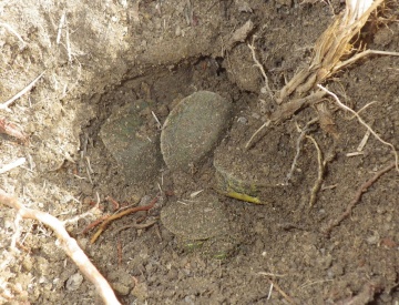 2020年6月、初音川ビオトープの一角で産卵中のミシシッピアカミミガメ(以下「アカミミガメ」)が確認されました(写真1、初音川ビオトープ愛護会 萩野鎭夫会長 撮影)。アカミミガメは春~初夏にかけて、土に穴を掘って産卵します。ニホンイシガメやスッポンなどとは異なり、ふ化しても子ガメはそのまま土の中で冬を過ごし、翌春になってから出てくることが知られています。そこで、土の中から出てくる前に産卵巣(さんらんそう、メスが産卵のために掘った穴と産み落とされた卵)の様子を観察するため、2021年2月に掘り起こしを行いました。