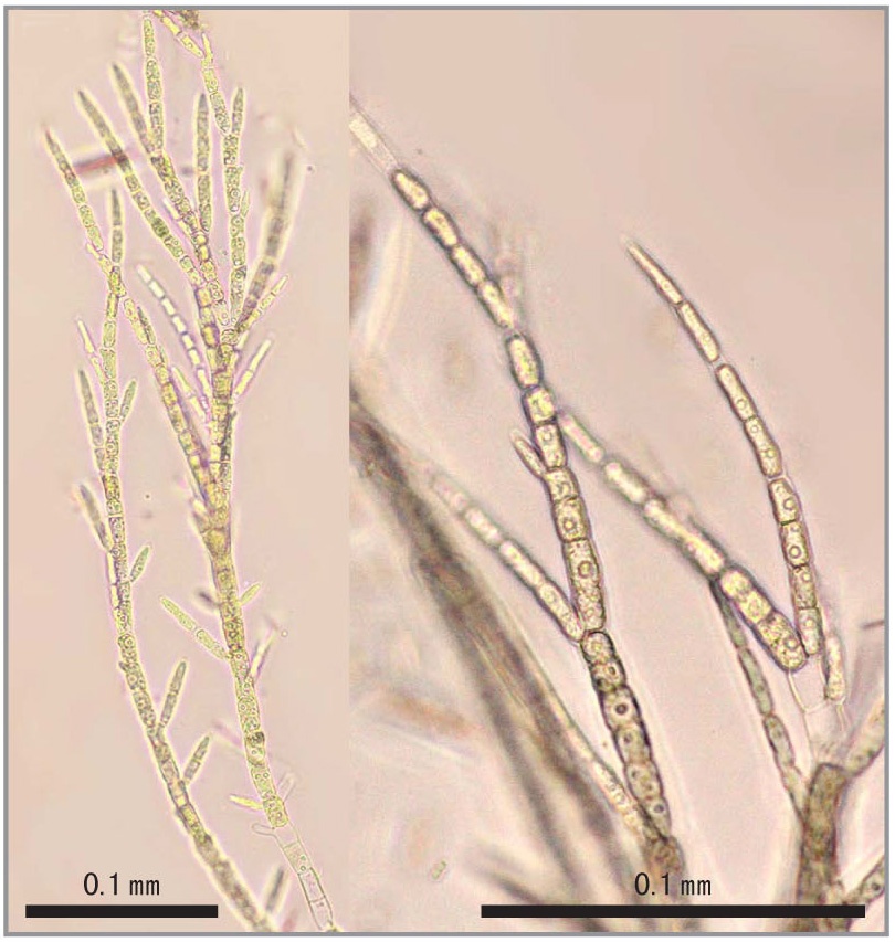 きれいな緑色をした肉眼的な糸状緑藻です。時々、矢作川の川底の石にも生えています。矢作川でなじみの糸状緑藻といえば、通称「アオンドロ」と呼ばれるカワシオグサ(<i>Cladophora glomerata</i>、<a href="https://www.yahagigawa.jp/ikimono/entry-345.html">矢作川の生き物No.20</a>)です。スティゲオクロニウム属も肉眼でよく見ると枝分かれしているので、ついカワシオグサと思ってしまいます。顕微鏡でみると、スティゲオクロニウム属は、枝についた細胞の先端は細くなっていて、全体にエレガントな感じがします。今のところ、スティゲオクロニウムの一種が、カワシオグサのように矢作川の川底一面を覆い尽くす事態は確認されていません。