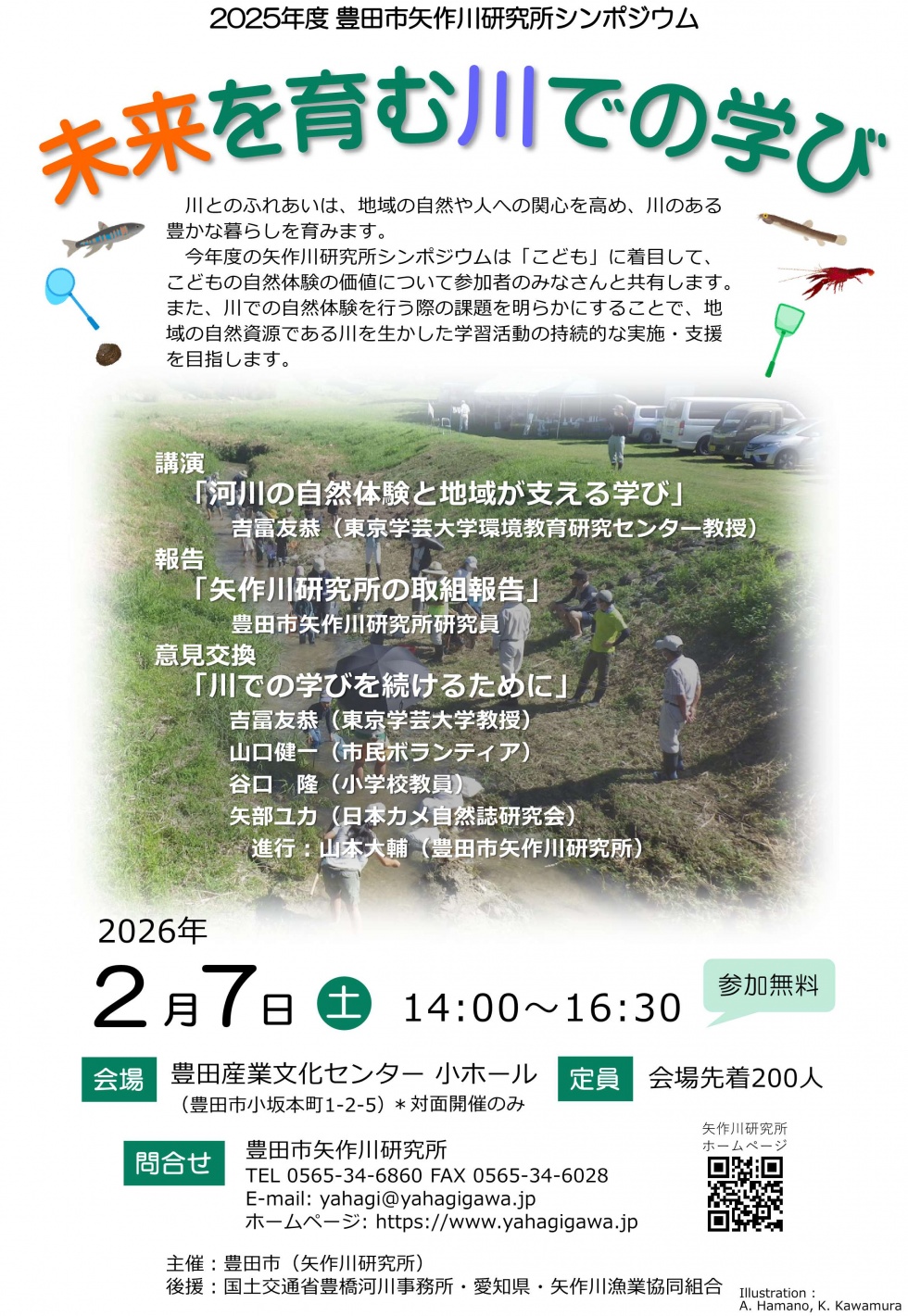 今年度の矢作川研究所シンポジウムは「こども」に着目して、 こどもの自然体験の価値について参加者のみなさんと共有します。 また、川での自然体験を行う際の課題を明らかにすることで、 地域の自然資源である川を生かした学習活動の持続的な実施・支援を目指します。 ぜひお越しください。