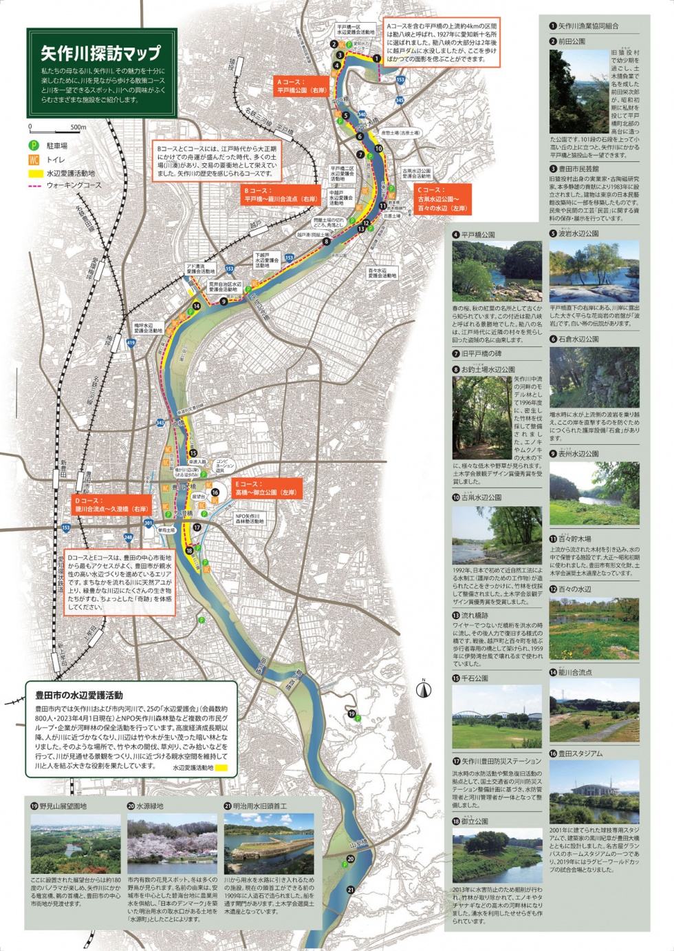 2018(H30)年に発行した「矢作川探訪マップ」を増刷するにあたり、紙面のリニューアルを行いました。 下方にPDFファイルがあります。紙の地図は矢作川研究所か豊田市役所南庁舎1階の市政情報コーナーでご入手頂けます。 ぜひこのマップとともに、矢作川の川辺の魅力を見つけにお出かけください。