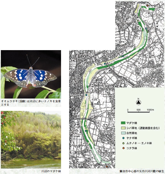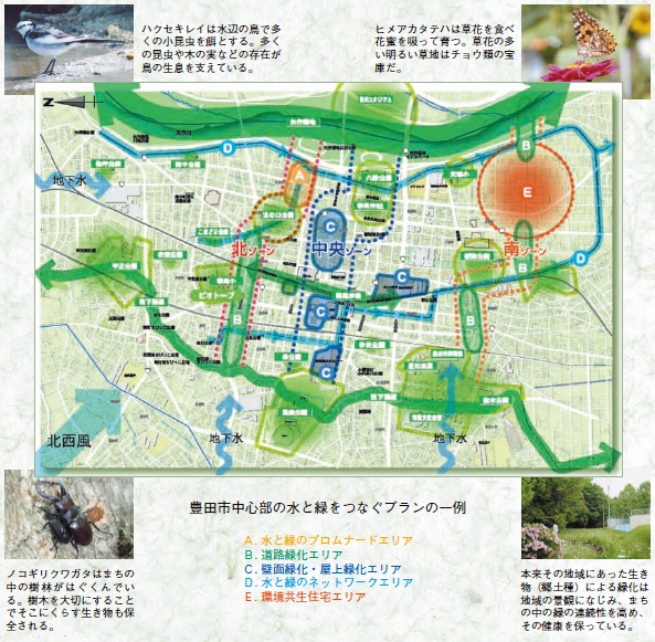 市街地の川や自然緑地は大気の浄化や防音・防風の効果を持ち、ヒートアイランド現象を抑制するだけでなく、住民が心を癒し、野生生物とふれあえる場となっています。豊田市の中心市街地で矢作川を生かしたまちづくりを進めるため、自然環境の現状と歴史、市民意識の調査をおこないました。
