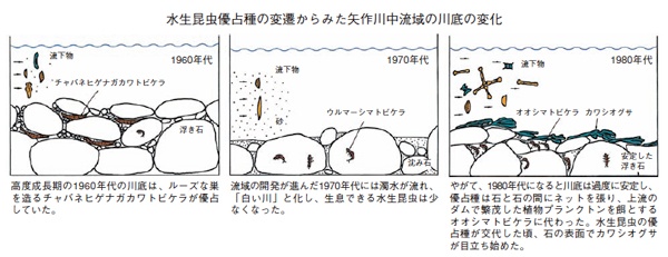 矢作川中流域の不健全さの象徴とされたカワシオグサの異常繁茂は1980年代後半から観察されるようになりました。カワシオグサは川底の石に付着して成長する藻類です。カワシオグサが卓越するようになった川底の変化をみると、この半世紀の間に大きく変化したことがわかりました。