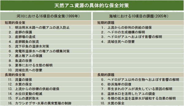 愛知県内でも有数のアユ釣りのできる川として知られる矢作川では、毎年シーズンになると多くの釣り人で賑わいますが、アユが生息する上で様々な環境面の問題があります。そこで、1996年から1997年にかけて河川におけるアユの生活史調査を、2000年から2004年にかけては海域における生活史調査を網羅的に実施し、生息上の問題点を明らかにしました(表参照)。