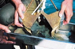 矢作川河口周辺の海域では多くの場所で海底にヘドロ(有機物を多く含んだ泥)が堆積しています。河口近くのヘドロが堆積した場所でアユが採れない傾向にあることが判明し、他の生物もそこではあまり採れないことから矢作川流域の大きな問題であると考えています。