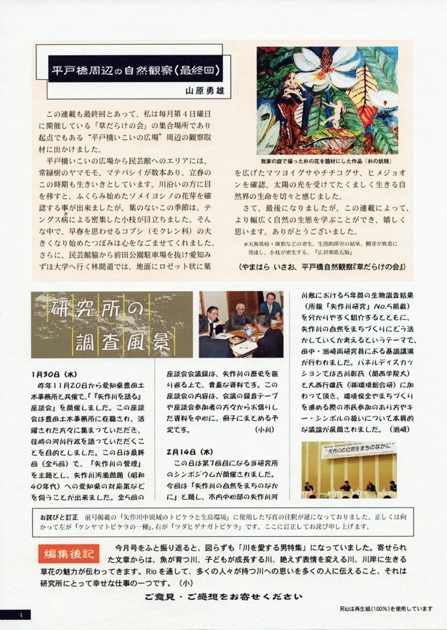 矢作川とその河辺の自然は、豊田市の市街地を心なごむ環境とするために大変重要な存在です。豊田市矢作川研究所は、市内中心部の矢作川都市ブロック(越 戸ダム~鵜の首橋間)の河川敷で、植物・昆虫類・鳥類・哺乳類の調査を5年にわたって行い、その成果を所報「矢作川研究」の第5号にまとめました。