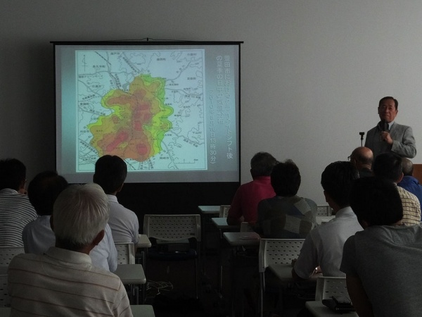 7月26日(日)に豊田市福祉センター会議室で、愛知教育大の大和田道雄名誉教授に「都市の高温化によるくらしへの影響 ~ヒートアイランドの現状と課題~」をテーマとしてご講演頂きました。真夏に全国一の気温が観測される地点の多くが、豊田の市街地同様、内陸部の盆地にあります。豊田市は森林率が約7割と高いのですが、市街地を含む市南西部の緑は多くありません。ヒートアイランド強度(都市と郊外の気温差の最大値)は緑被率が高ければ4度以内になり、名古屋では4度となっています。これに対し豊田市は1979年と1992年には3度だったのが、2012年には6度、2014年には9度まで上昇し、中規模の都市としては全国的にもまれな高さになっているとのことでした。ヒートアイランド強度の高まりは熱中症などの健康被害につながるため、緑化、とりわけ樹木の植栽による日影と気化熱の効果で、市街地の気温を下げることの重要性が指摘されました。