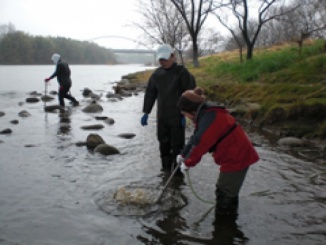 矢作川で大繁茂しているオオカナダモの駆除をNPO法人矢作川森林塾、矢作川漁協、天然アユ調査会、矢作川研究所などで協働し取り組んでいます。雨の土曜日、豊田大橋下で駆除の新兵器の試運転をしました。新兵器はT字型のパイプに圧縮した空気を通し、オオカナダモの根本に吹き付ける道具で、藻を根こそぎ浮かべようと考案されました。試運転の結果、まずまずの手応えがあり、これから本格的に駆除ができそうです。新兵器を使えば、ドライスーツを着用して潜らなくてもオオカナダモを取り除くことができるので、手軽に少人数で取り組むことができます。
