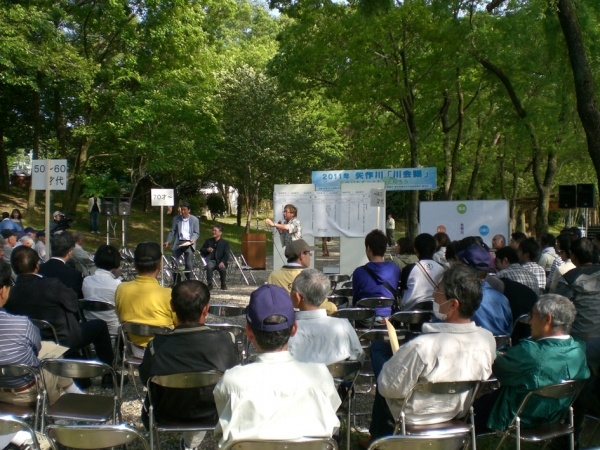 5月14日(土)新緑の気持ち良い青空の下で「矢作川をもっともっと知ろう」をテーマに矢作川「川会議」が行われました。今年は約250名の参加者がありました。まず国交省豊橋河川事務所の新髙副所長から、日本の他河川とも比較しながら矢作川の特徴をご報告頂きました。次に当研究所の山本研究員から矢作川で数を減らした魚たちと、川に関わる人の楽しみを増やす川づくりについての話がありました。続いて関西学院大の古川研究顧問から、矢作川流域ではさまざまな業界のステイクホルダー(利害関係者)が立場を超えて協調していることが大きな特徴とのご紹介がありました。その後、作家の阿部夏丸さんの進行のもと、会場の全ての方々のご参加により矢作川の思い出を語って頂きましたが、特に70代以上の方々が、矢作川で泳ぎ、魚を捕り、小遣い稼ぎをしていた頃のお話を生き生きと語って下さったのが印象的でした。矢作川を見つめなおすシンポジウムになったのではないかと思っております。ご参加頂いた皆様ありがとうございました。(洲崎、内田り)