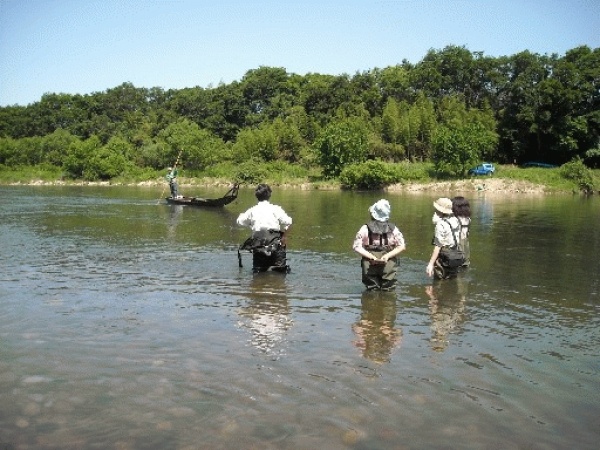 爽やかな5月の空の下、これからの季節に繁茂することが予想されるオオカナダモの調査の下調べに出かけました。 胴長やドライスーツに身を固めた私たちが川底からオオカナダモやエビモを採取していると、川下から釣り師Oさんが舟を竿で操って上ってみえて、オオカナダモの生息状況についてご教示くださいました。 タモ網で川底をすくうと、ヤゴ、エビ、ゲンゴロウ、カワニナなど様々な生き物たちが元気に飛び跳ねていましたが、古鼡水辺公園ではちょっと気の早い人間が負けずに矢作川に飛び込んでいました。(逵)