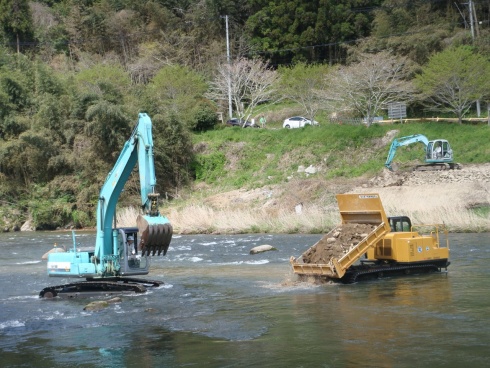 4/24-25に矢作川中流に礫を投入し、川底環境を改善することでアユのなわばり行動が回復するかを検証する実験を始めました。